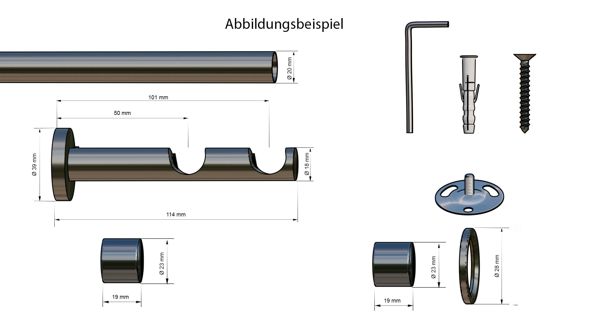 Bitte beachten Sie: Abhängig von der Darstellung Ihres Bildschirmes kann die Farbdarstellung der Produkte eventuell leicht von den Original Farben abweichen. Bitte reinigen Sie die Vorhangstange nur mit einem Staubwedel oder einem weichen, feuchten Tuch ohne Zusatz von Reinigungsmitteln.Set enthält:1 x Rundstange Ø20mm ab 200cm wird die Stange mittig geteilt geliefert. Ein Verbinder, sowie ein zusätzlicher Träger zur Stabilisation liegen der Bestellung bei 2 x Träger; ab 210cm 3 Träger 1 Ring + 1 Faltenlegehaken alle 10cm(z.B. 240cm = 24 Ringe + 24 Faltenlegehaken) Montageanleitung Schrauben Dübel Montageschlüssel