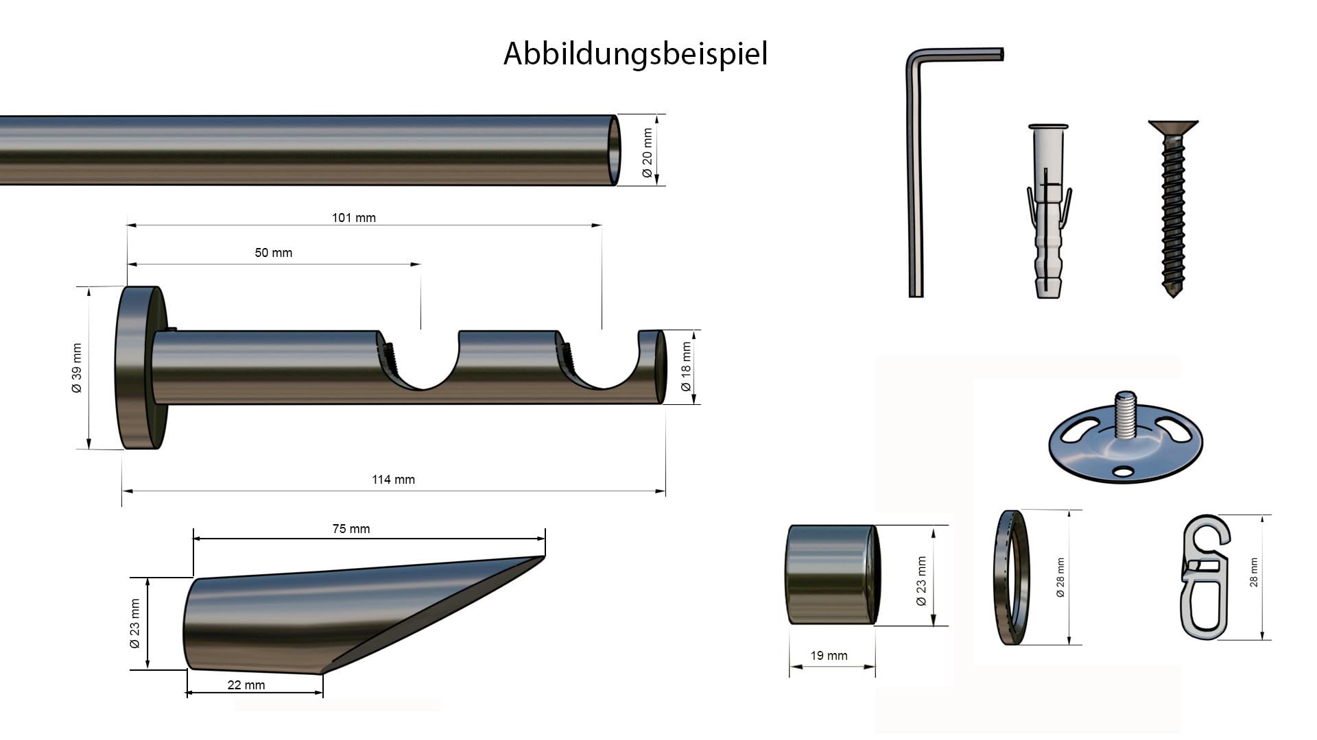 Bitte beachten Sie: Abhängig von der Darstellung Ihres Bildschirmes kann die Farbdarstellung der Produkte eventuell leicht von den Original Farben abweichen. Bitte reinigen Sie die Vorhangstange nur mit einem Staubwedel oder einem weichen, feuchten Tuch ohne Zusatz von Reinigungsmitteln.Set enthält:1 x Rundstange Ø20mm ab 200cm wird die Stange mittig geteilt geliefert. Ein Verbinder, sowie ein zusätzlicher Träger zur Stabilisation liegen der Bestellung bei 2 x Träger; ab 210cm 3 Träger 1 Ring + 1 Faltenlegehaken alle 10cm(z.B. 240cm = 24 Ringe + 24 Faltenlegehaken) Montageanleitung Schrauben Dübel Montageschlüssel